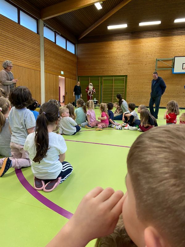 Die Kinder folgten sogleich der Aufforderung zum Nikolaus zu kommen und ihr Tütchen mit Leckereien und einem Pixi- Turn- Büchlein entgegen zu nehmen. In Begleitung der ein oder anderen Mama trauten sich die Jungs u Mädchen zum Weihnachtsmann zu gehen und ihr Geschenk abzuholen.